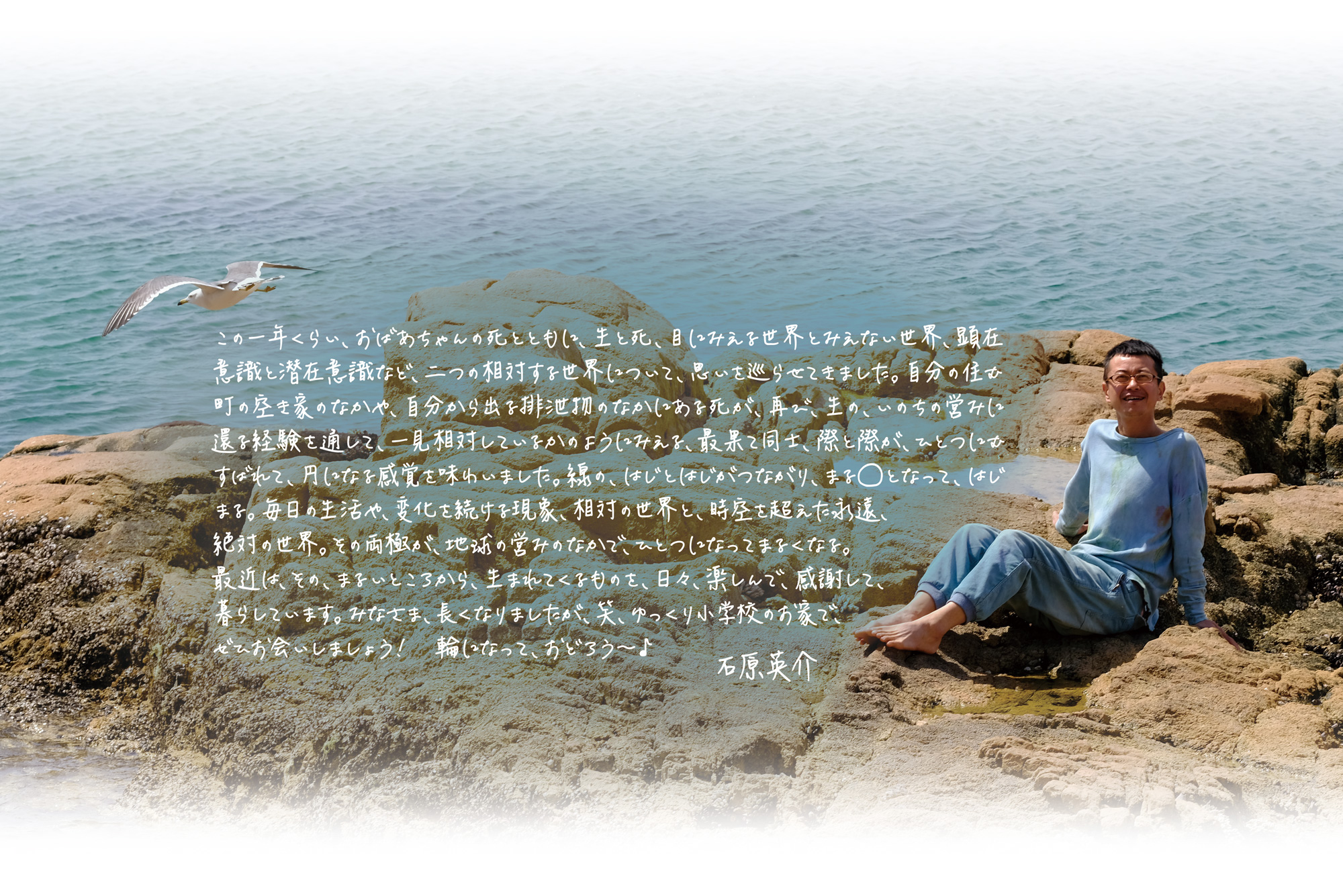 英介さんはなにより、植物や微生物、地球を愛する生活者です。いつも自然体で、敬虔で慎み深く、人々に笑顔を、愛を、おくり続けています。本会は作品展に留まらず、ゆっくり小学校の“家”で、石原英介の表現、暮らし、生き方、想いを体感できる、インスタレーションです。